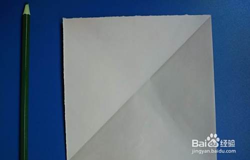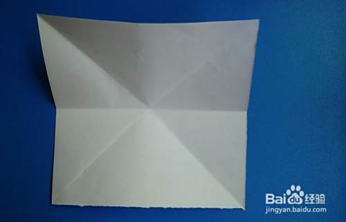 将正方形彩纸的上方,拿着一角沿对角线对折二次后,然后沿着中间线对折一下,成为米字形折痕,如下图所示。