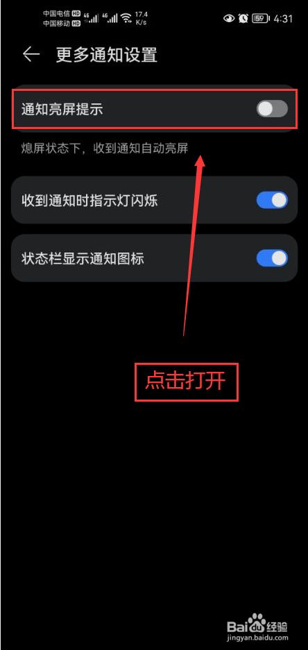 然后,点击打开通知亮屏提示功能开关(图片中圈红的部分)