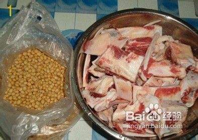 把洗净的牛骨和黄豆放到锅中,同时加入少许酒;