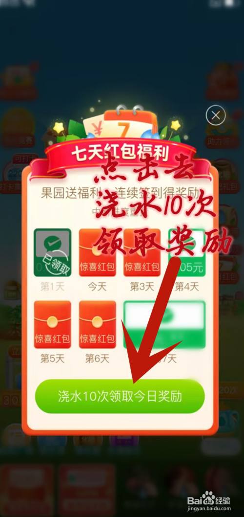 果园页面点击领取7天红包福利,按要求次数去浇水才能领取红包福利奖励,连续浇水签到可以领取惊喜红包,否则重新开始任务。