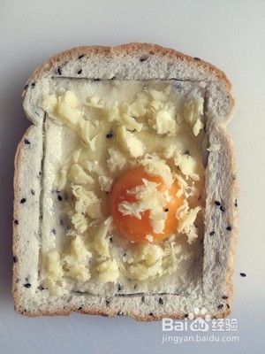 打入鸡蛋,可以是整蛋黄,不过把蛋黄打散可以减少烘烤时间,撒上芝士。