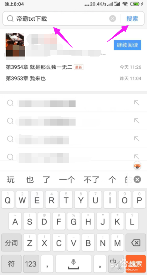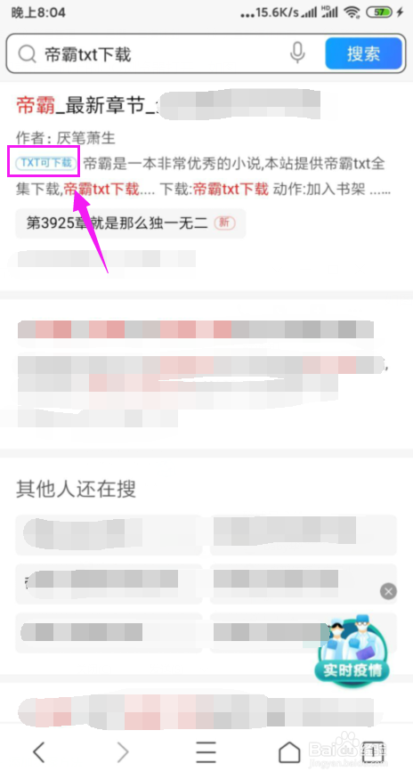 接着在浏览器中输入【电子书名称+txt下载】,点开【搜索】,如图。