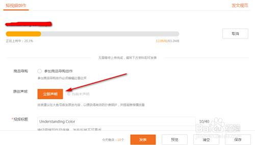 然后我们需要把素材导入,记得要点击原创声明,然后填写相关信息。这是发视频等待有播放量才会有收益。