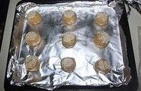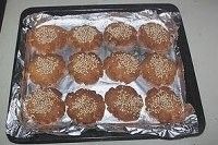 然后将小球芝麻朝上放到烤盘里,重复上面的动作将烤盘摆满,小球之间要留有大一点的空隙。
