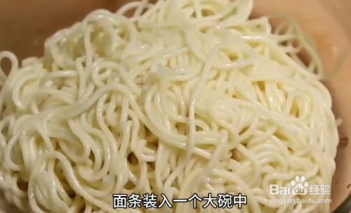 面条煮熟后捞出,过一下冷水,装入一个大碗中。