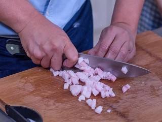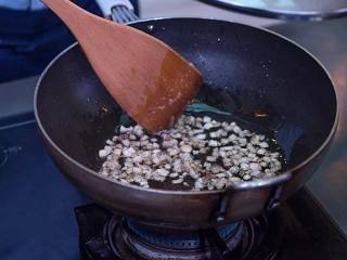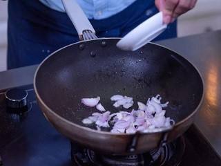 锅内倒入猪油和红葱头,小火,煎至金黄色。