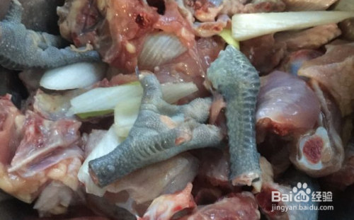 将买来的鸡切小块,洗净血水,放入盆内,倒入料酒、盐腌制15分钟