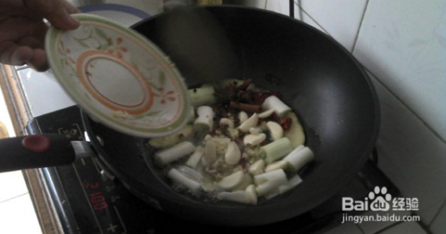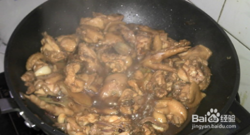 起锅放油,油热后放入肉条炸出油,放入鸡块进行翻炒,炒至鸡块出油,甚至有些粘锅,然后倒入开水