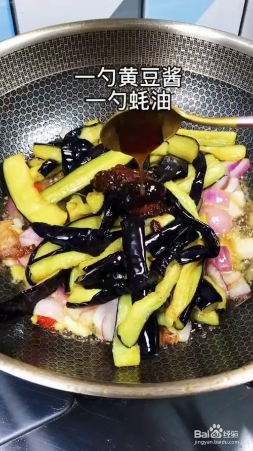 放入茄子,黄豆酱,蚝油,生抽,盐,白糖,大火翻炒入味,出锅撒上葱花,即可开吃啦