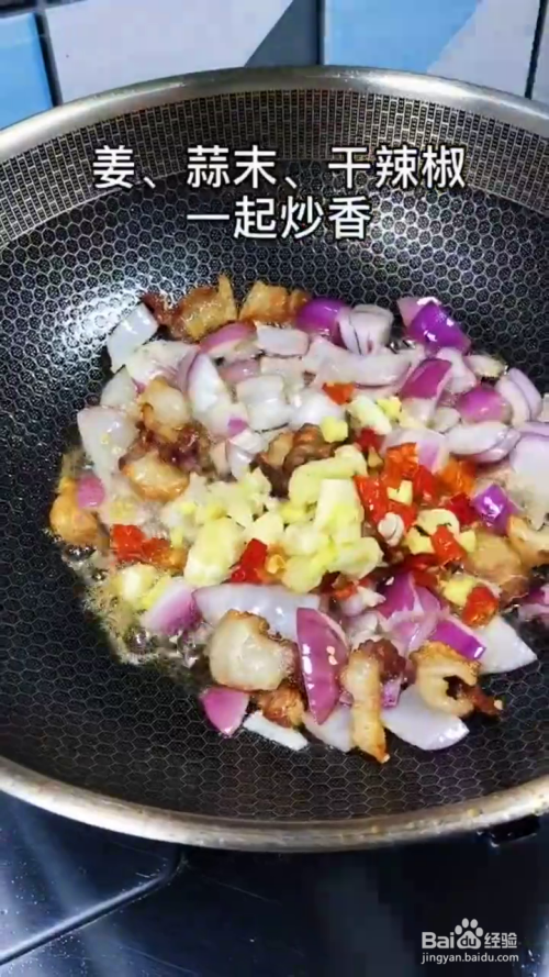 锅中留底油,加入五花肉炒出多余的油脂,再加入葱姜末,干辣椒,洋葱炒出香味