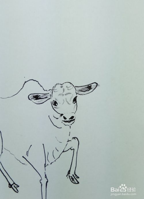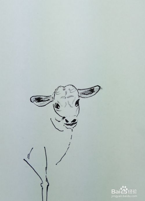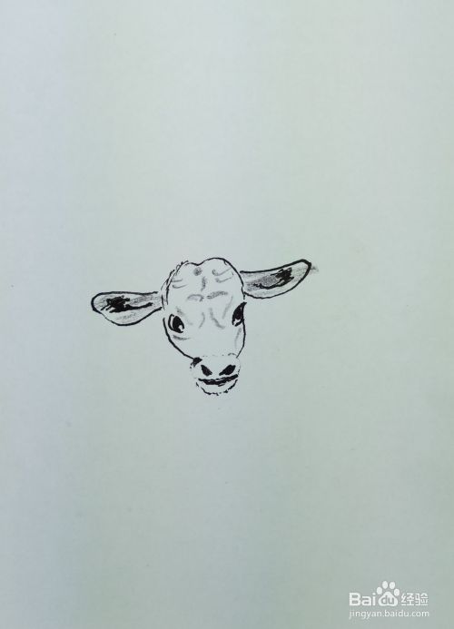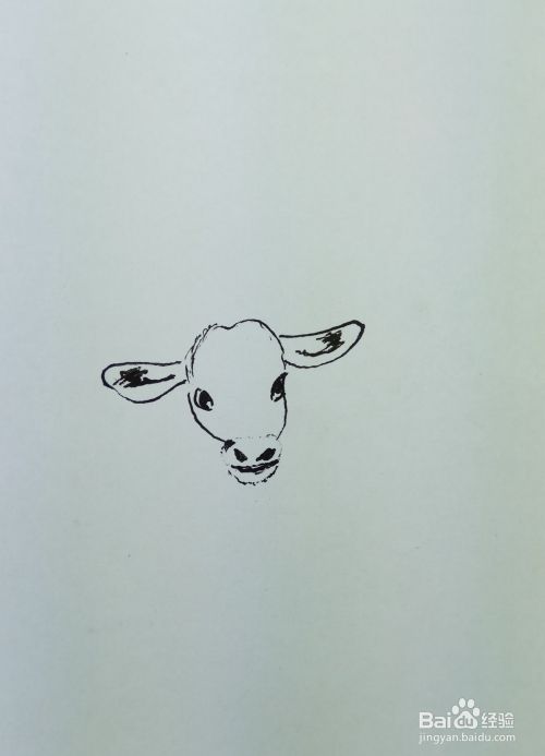 在白纸上用线条和曲线画出一头牛的头部轮廓,并画出牛的眼睛,鼻子,嘴巴和两个耳朵再画牛的头部轮廓的时候可以用实线条。