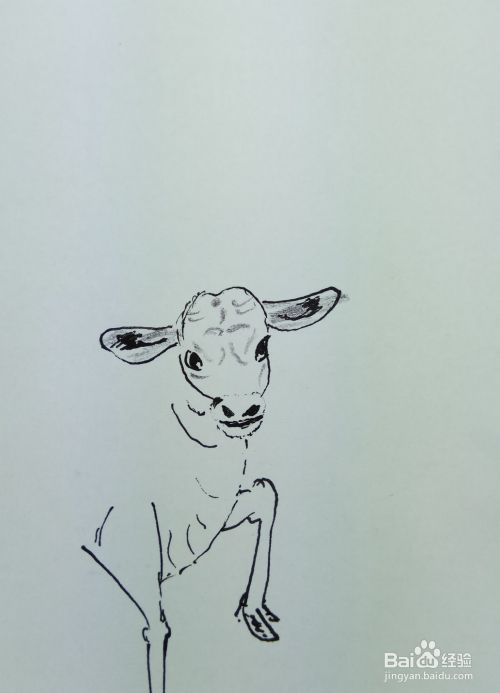 用线条和曲线画出牛的脖子和前腿部分,注意弧线的位置,还有牛的右边腿的位置。