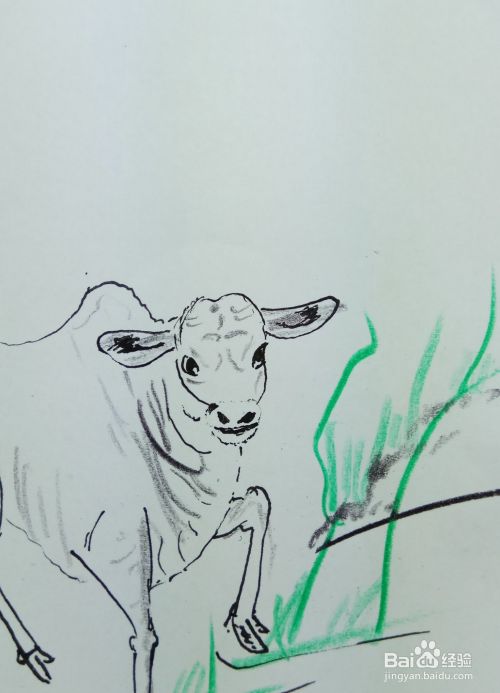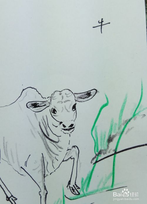 用粗线条画出地面背景部分,再用水彩笔画出地面上的绿草,用线条画出老牛的脖子上纹路,简笔画就画好了,喜欢的朋友也可以来尝试画一下。