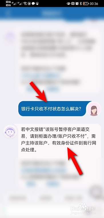 发送银行卡只收不付怎么解决,之后客服就会回复解决方法:需要持身份证到网点处理。