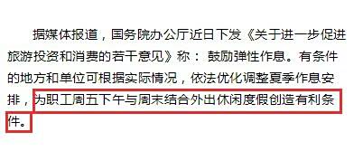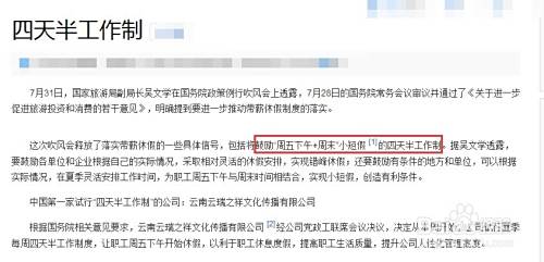 所谓四天半工作制,就是每周的休息时间变为“周五下午+周六日”,一周七天,上四天半的班,休息2.5天。这一消息并不是普通工作者呼吁出来的,而是由国家首先发出的消息。但是,说法不是规定,只是说要鼓励这种制度,所以它能否真得实行并不得而知。