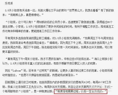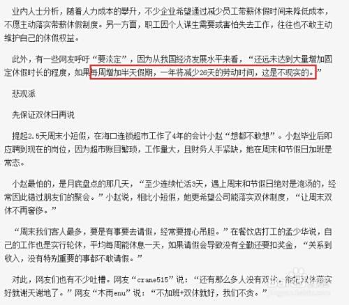 悲观者——实行困难:一方面,这不是国家强制的规定,另一方面,这个制度对于公司老板可能是不利的,至少从其内心会有这种想法,因此,要想普通大众享受到这种待遇还是很困难的。更有甚者,好多单位双休还难以实现,休息2.5天显然是更不太可能。