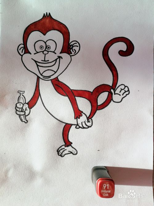 7、用48、123号马克笔将香蕉上色,用17号马克笔将猴子肚皮跟脸部上色。