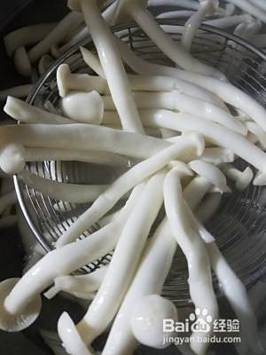 锅中加水烧开把海鲜菇焯水捞出(把素菜焯水的步骤是为了保持汤汁清澈,汤汁的味道不被破坏,这步很关键不可偷懒,否则直接影响到汤的整个口感)