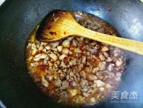 3下鸡丁炒,鸡丁一定要切的小,这样容易煸炒入味。炒的时间尽量的长,炒得表皮有一点干为佳。那样口感香味都要好上不少,我炒了10多分钟。