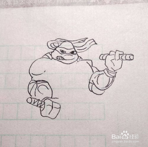 接着我们再画出忍者神龟的两只手臂还有手臂上的肌肉,再画出它的两只手和手里的兵器。接着画出忍者神龟身上的肌肉,再给它画一条腰带,再画出它的右脚,还有描出它的腿部肌肉。