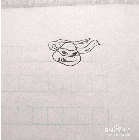 第一步我们先画出忍者神龟的头部,再然后画出忍者神龟的眼睛还有它头上绑着的绳子。