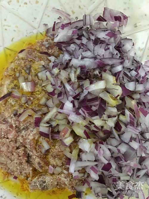 肉馅加入油,放入圆葱碎。