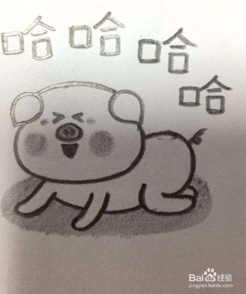 最后做个修饰,再给它配个生动形象的词语,这样一只笑趴下的小猪就画好了