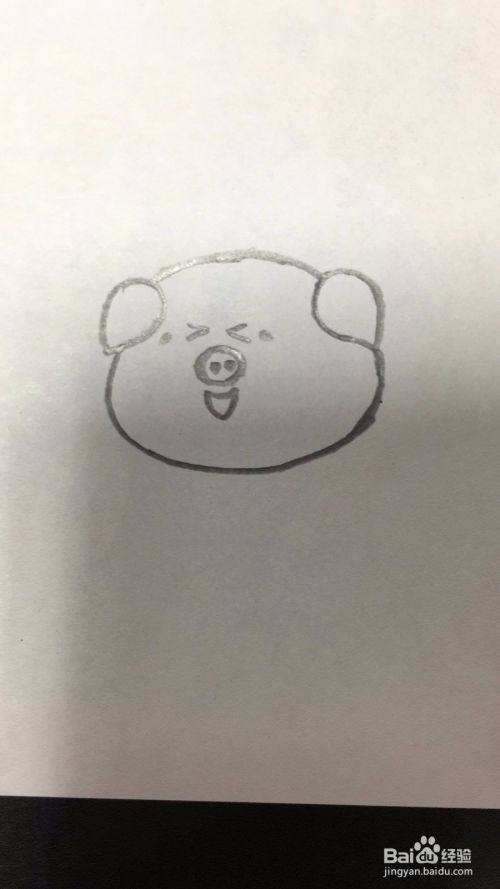 第三步画小猪笑的都快挤到一起的眼睛,然后画出它的大鼻子以及笑张开的嘴巴