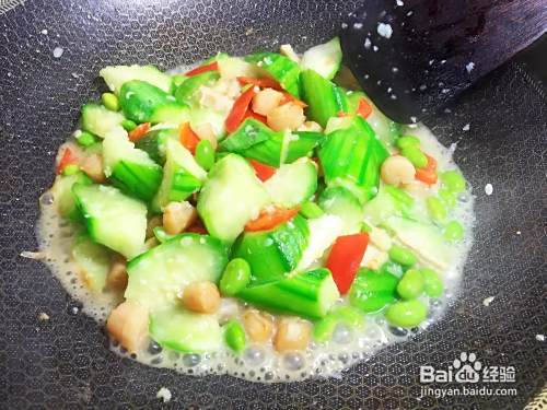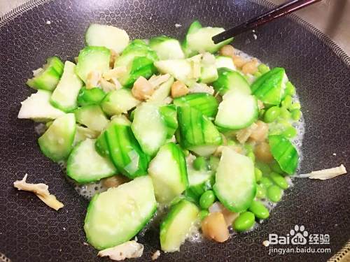 7号。将蚕豆炒至丝瓜肉由白色变为半透明。加盐调味,迅速食用。