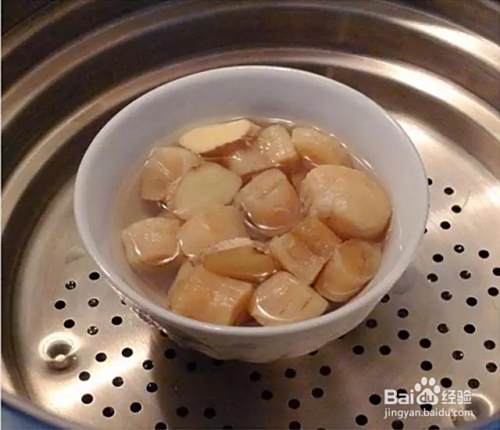 2。将水和黄酒加入扇贝中,提前一天晚上浸泡;或用大火蒸20至30分钟,然后用文火炖10分钟。