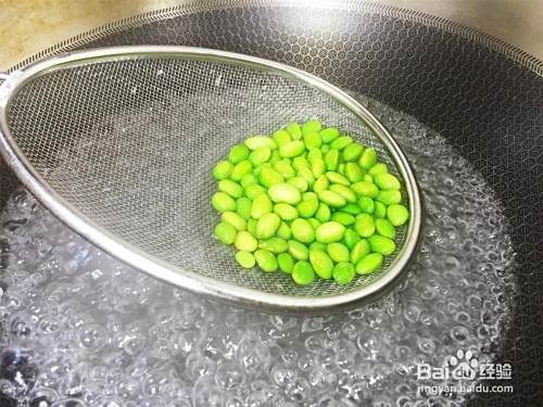 三。将一把毛豆子放入沸水锅中,煮至七八分钟熟,取出,用冷水迅速洗净,冷却,以保持其色泽鲜艳。