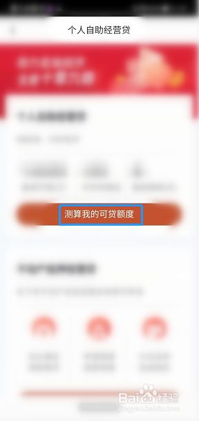 点击进入个人自助经营贷界面,测算可贷额度即可。