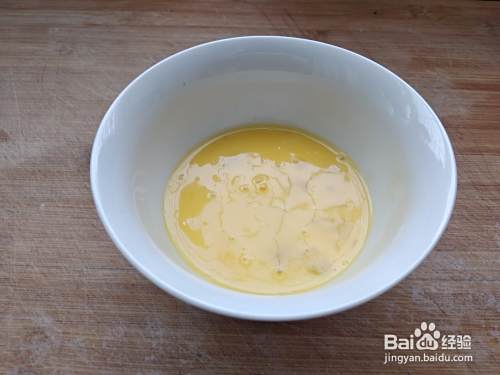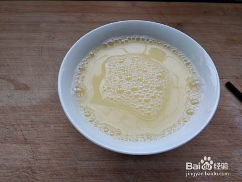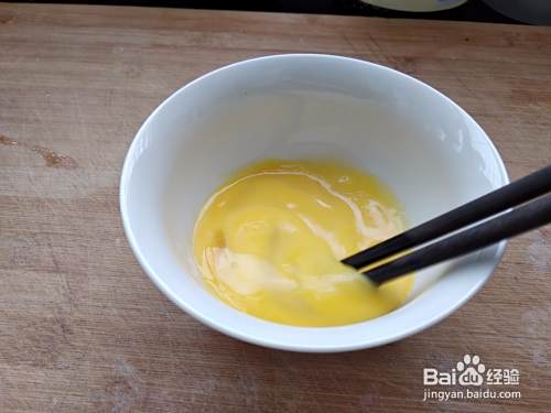 把鸡蛋用筷子朝一个方向打散。(不要随便搅拌,要按一个方向)