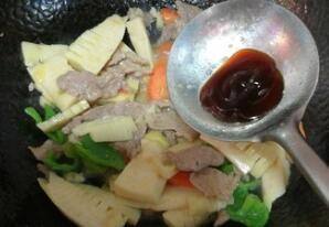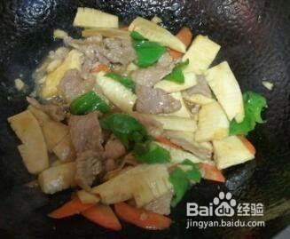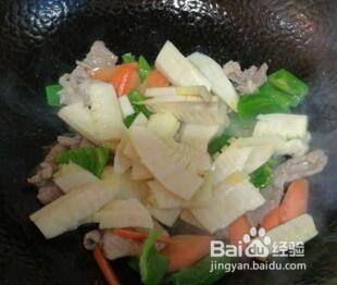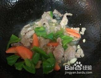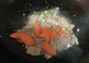 翻炒至猪肉片变色出香味后放入胡萝卜片;