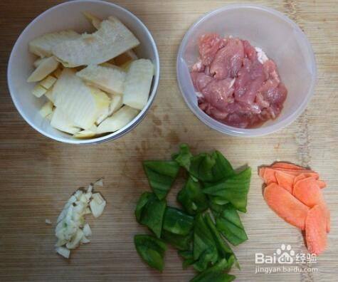 将冬笋去除外皮后切片,而且缩短炒的时间,猪肉切片后用少量盐和淀粉拌匀,而且很入味,胡萝卜切片,青椒切块,大蒜切碎;