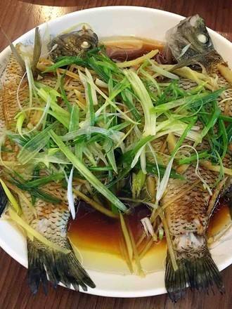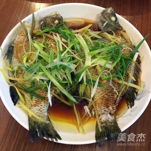 7蒸熟后,将鱼取出,淋上酱油,撒上切好的葱丝。