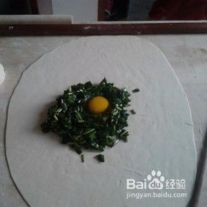 把鸡蛋和菜调匀,均匀的摊在圆饼上