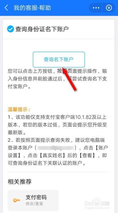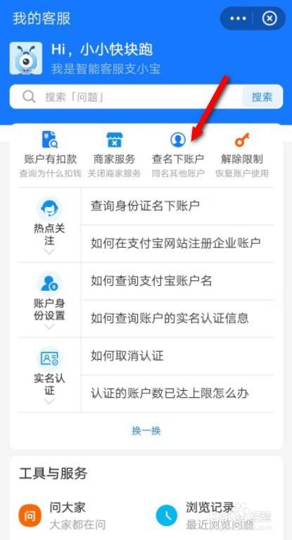 在支付宝里面点击我的客服,点击查名下账户功能,就会在页面里显示账户了。