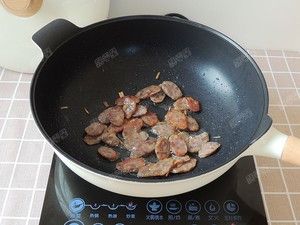 放入切好的香肠片,小火煸炒出油,脂肪部分透亮后盛出