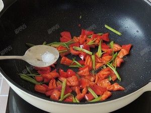 用锅里煸炒香肠出的油来炒芹菜和红椒,加入少许盐调味