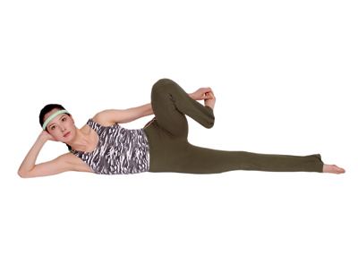 2吸气,曲双膝,脚跟尽量接近臀部。
