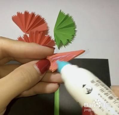 把花瓣的左右两面都涂上胶水,沿着顶部贴好,绿色的在最下面,把卡片合并,压一下,使胶水粘合在卡片上。