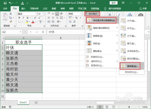 点击“开始”选项卡下“条件格式”-“突出显示单元格规则”-“重复值”。