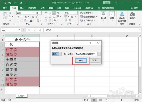 弹出“重复值”对话框,点击“确定”就可以筛选出重复值。