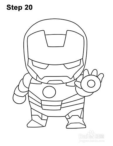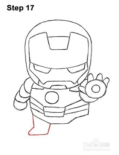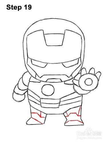 第19步:在腿上增加几条线,以获得护甲的额外细节。使用斜线而非曲线代表迷你钢铁侠的刚性金属盔甲。这种装甲由每只脚内的斜线和每条腿内的斜线组成。