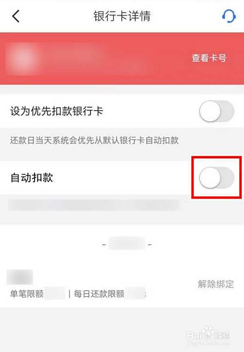 打开银行卡详情页面,选择自动扣款右侧的开关取消即可;