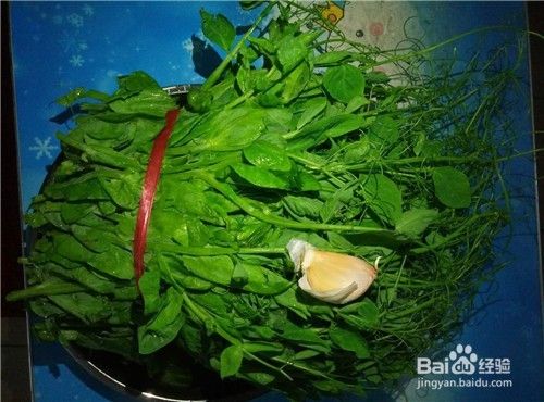 准备好所有材料:新鲜的豆苗一把,蒜头两瓣。