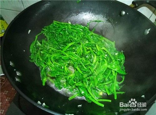 豆苗不停地上下翻炒到软,然后加入适量的盐,翻炒均匀。