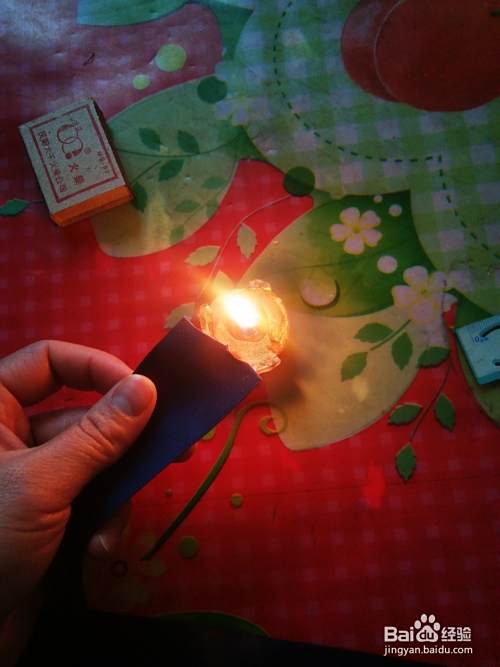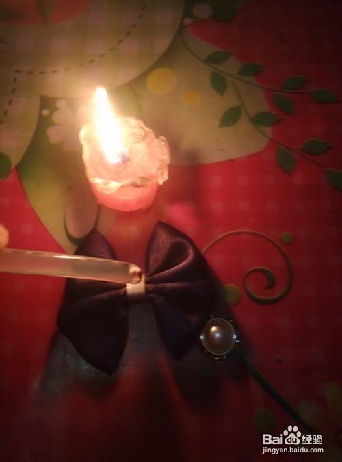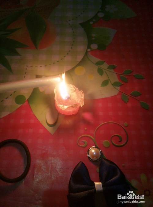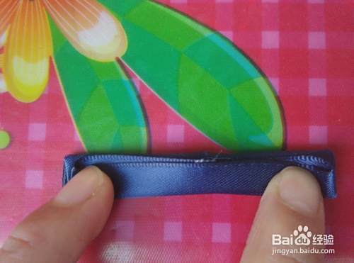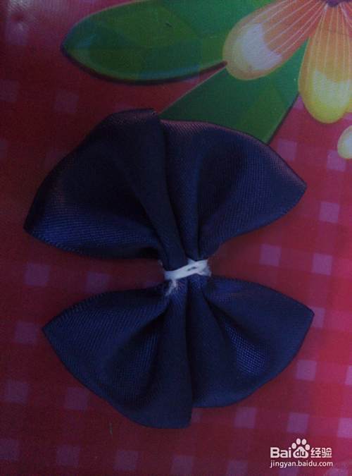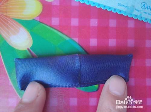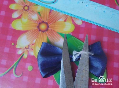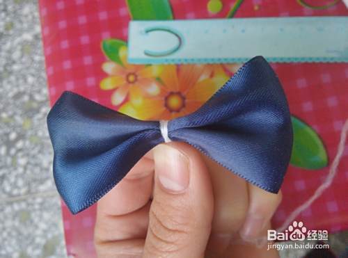从被面对着,然后再进行如图对折,对折之后,用QQ线从中间进行缠绕拉紧,再用剪刀剪去多余先头,也可以在火上了一下。好了,一个小蝴蝶结就做好了。将另一条绸缎也按上面的方法操作,再将两个蝴蝶结缠绕在一起。