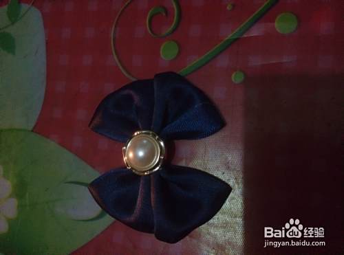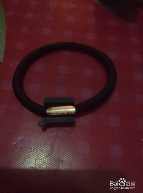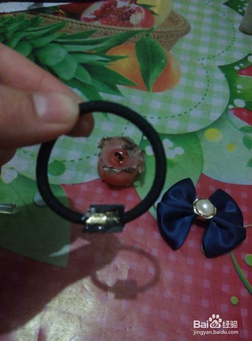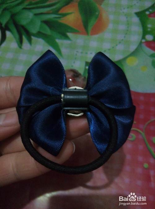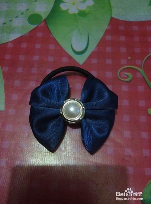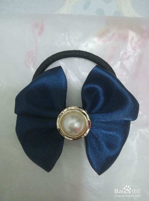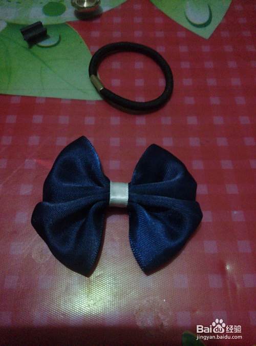 用棒棒胶先将发圈的金属部位粘贴到发圈底托扣上,然后再将发圈和托扣一起粘贴到蝴蝶结背面白绸带部位。好了,一款简单的蝴蝶结发式就做好了,美美们不知道学会了吗!